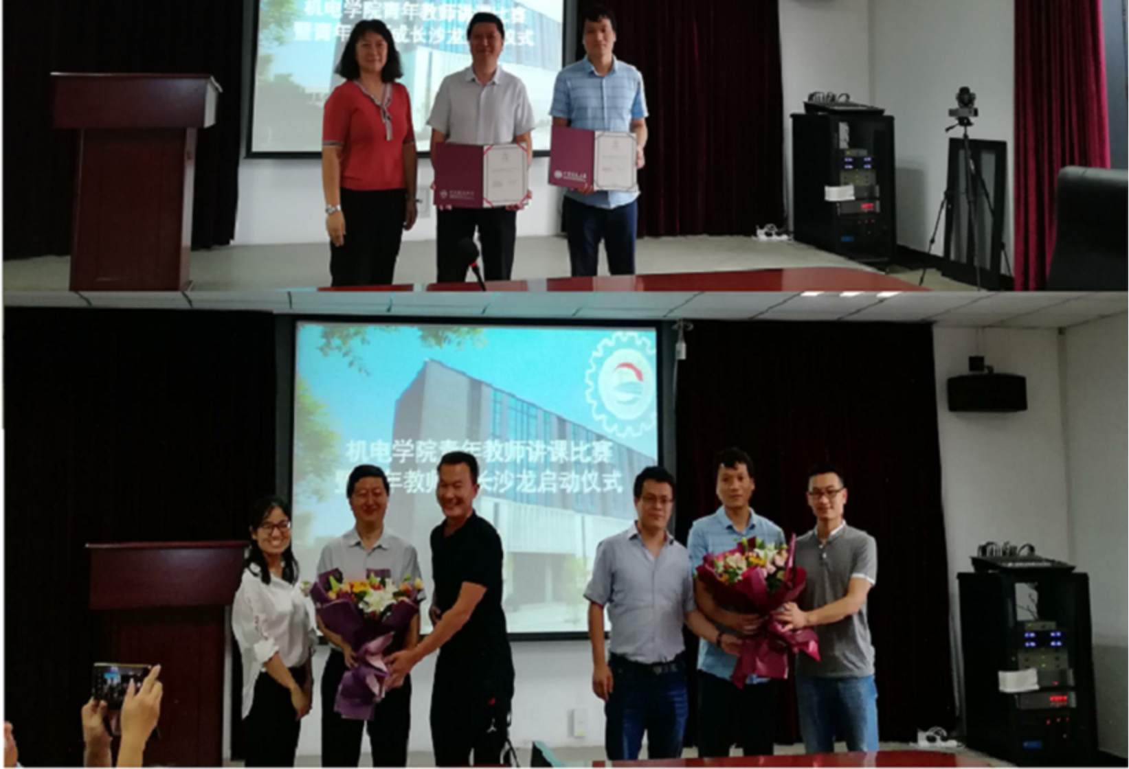 正式比赛前,党委书记赵海云宣读了学院关于聘任2020年青年教师导师的通知,并为三位导师颁发了聘书,被指导的青年教师怀着敬意之情为导师送花。